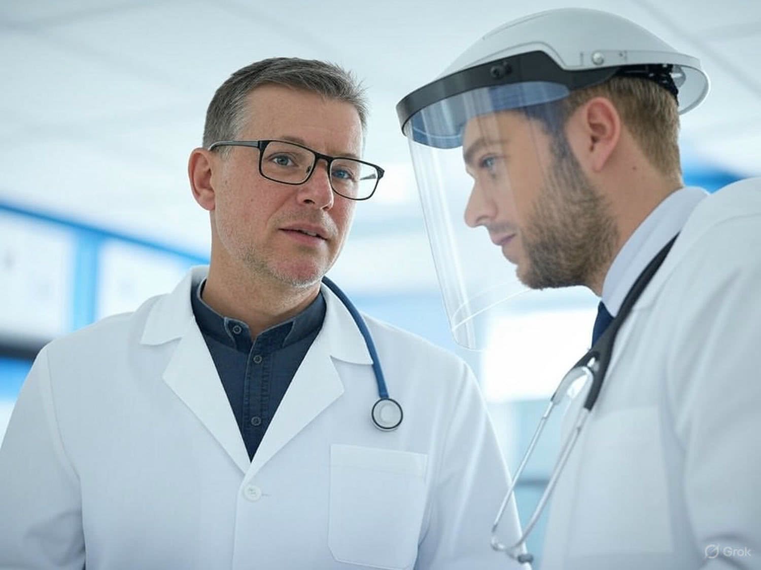 Semi-realistic illustration: of a male doctor in a white lab coat, wearing a stethoscope and glasses, examining a worker wearing a protective helmet in a well-lit, modern office. The doctor has a professional expression and is focused on the worker. The background features a clean, organized office with subtle blue and green accents, symbolizing health and safety. There are no distracting elements like screens or excessive foreground objects. The overall scene is calm and focused, emphasizing the doctor-patient interaction in a safe and professional environment. IMAGE STYLE: Use a sophisticated color palette of deep brown, deep blue, gray, and a touch of purple, red and orange for a high-tech feel. The background should suggest modern medicine. The mood should be precise, educational, and cutting-edge, appealing to medical professionals and students.