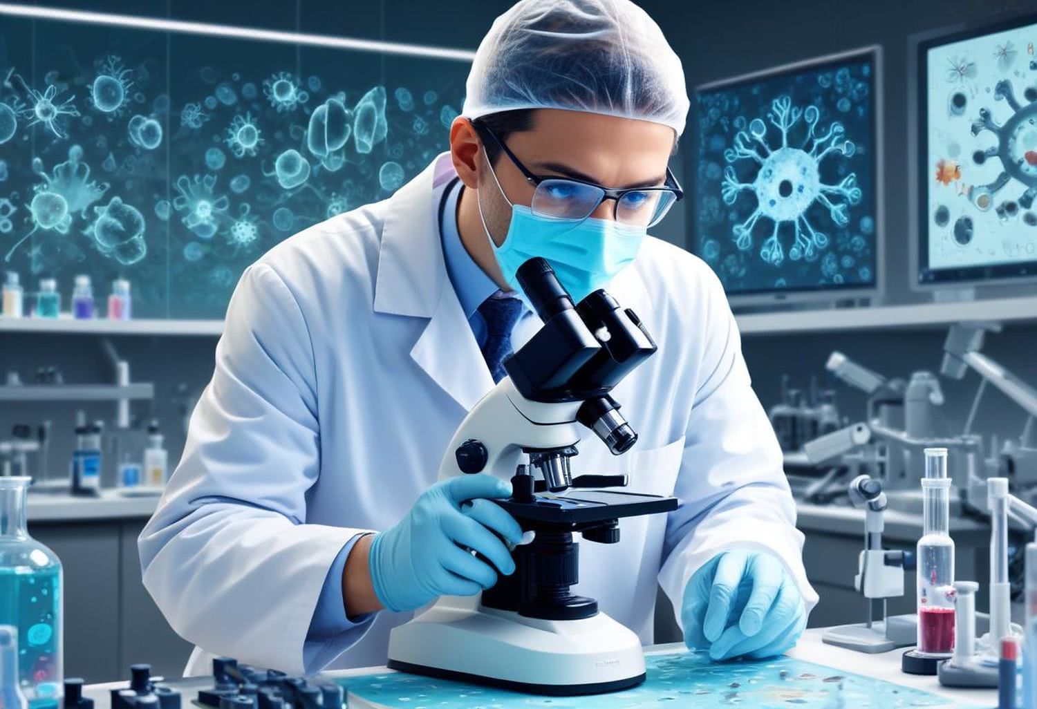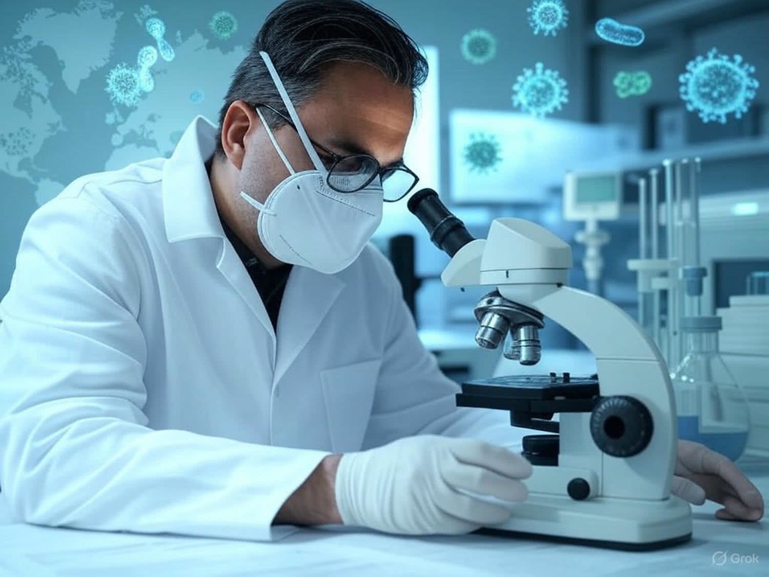 Semi-realistic illustration: of a doctor specializing in infectious diseases, wearing a white lab coat and a protective mask, focused on examining a sample through a microscope in a modern, well-lit laboratory. The background features floating symbols of viruses, bacteria, and fungi, and a subtle world map with highlighted epidemic areas. The lab is equipped with modern scientific instruments, maintaining a clean and professional environment. The dominant colors are blue and green, enhancing a sense of trust and scientific inquiry. The scene is dynamic yet focused, emphasizing the doctor’s engagement with the microscopic world without unnecessary distractions. IMAGE STYLE: Use a sophisticated color palette of deep brown, deep blue, gray, and a touch of purple, red and orange for a high-tech feel. The background should suggest modern medicine. The mood should be precise, educational, and cutting-edge, appealing to medical professionals and students.
