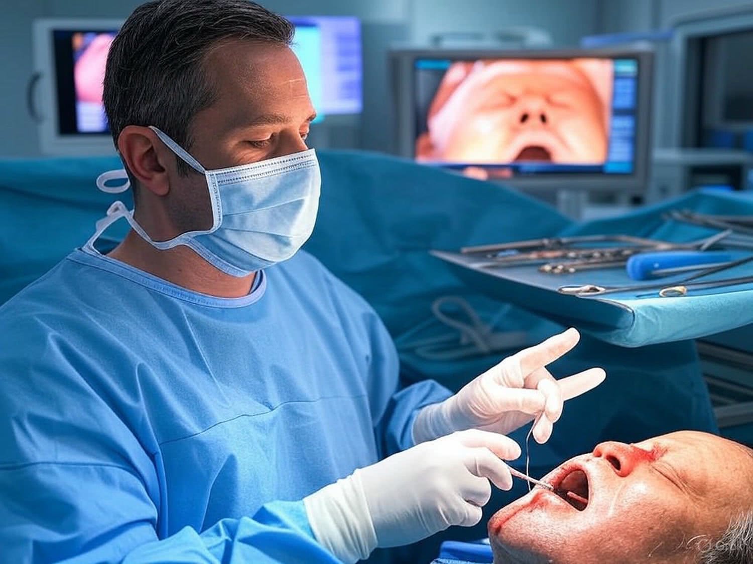 Semi-realistic illustration: of a male oral and maxillofacial surgeon in a well-lit, modern operating room, focusing on his face as he performs a precise surgery on a patient’s jaw. He wears surgical scrubs and a mask, with a focused expression. Advanced surgical instruments are visible on a tray beside him, and a monitor in the background displays the patient’s vitals. The room features stainless steel surfaces and bright overhead lighting, emphasizing a professional and clinical atmosphere. The background is slightly blurred to keep the focus on the surgeon and the surgical area, highlighting his expertise and care for facial and oral health. IMAGE STYLE: Use a sophisticated color palette of deep brown, deep blue, gray, and a touch of purple, red and orange for a high-tech feel. The background should suggest modern medicine. The mood should be precise, educational, and cutting-edge, appealing to medical professionals and students.