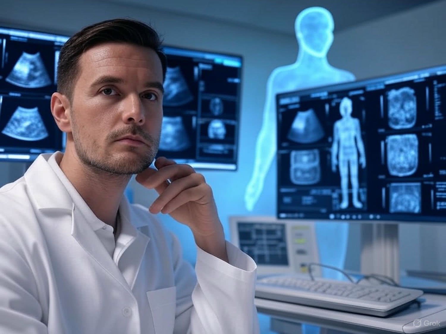 Semi-realistic illustration: of a radiologist in a modern medical laboratory, wearing a white lab coat and focused on medical imaging monitors displaying X-rays, ultrasound, CT, and MRI scans. The radiologist, with a thoughtful expression, is centrally positioned with the monitors clearly visible. In the background, there is a semi-transparent human figure symbolizing medical imaging, with subtle blue and green lighting creating a professional atmosphere. The room features clean, modern decor without distracting elements, emphasizing the importance of diagnostic imaging in medicine. IMAGE STYLE: Use a sophisticated color palette of deep brown, deep blue, gray, and a touch of purple, red and orange for a high-tech feel. The background should suggest modern medicine. The mood should be precise, educational, and cutting-edge, appealing to medical professionals and students.