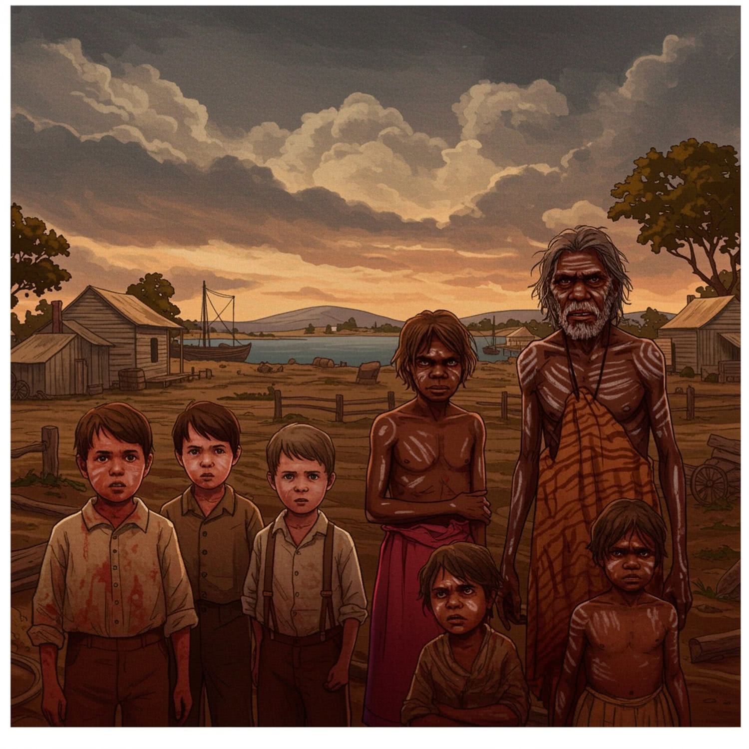 Semi-realistic illustration: of a group of children and Aboriginal people in a late 19th-century Australian settlement, depicting the measles epidemic of 1866-1867. The scene is set in a village with traditional Australian architecture and a harbor visible in the background. The main focus is on a few children and an Aboriginal elder, showing their faces clearly with signs of illness. The children are dressed in simple period clothing, and the elder wears traditional Aboriginal attire. The background features a cloudy sky and a rural landscape, enhancing the dramatic and somber atmosphere. The image uses warm tones and contrasts of light and shadow to emphasize the historical context and the impact of the epidemic, without any modern elements. IMAGE STYLE: Use a vivid color palette of deep red, orange, deep brown, gray and a touch of purple and bright red to give the impression of the threat of diseases and the epidemics they cause.