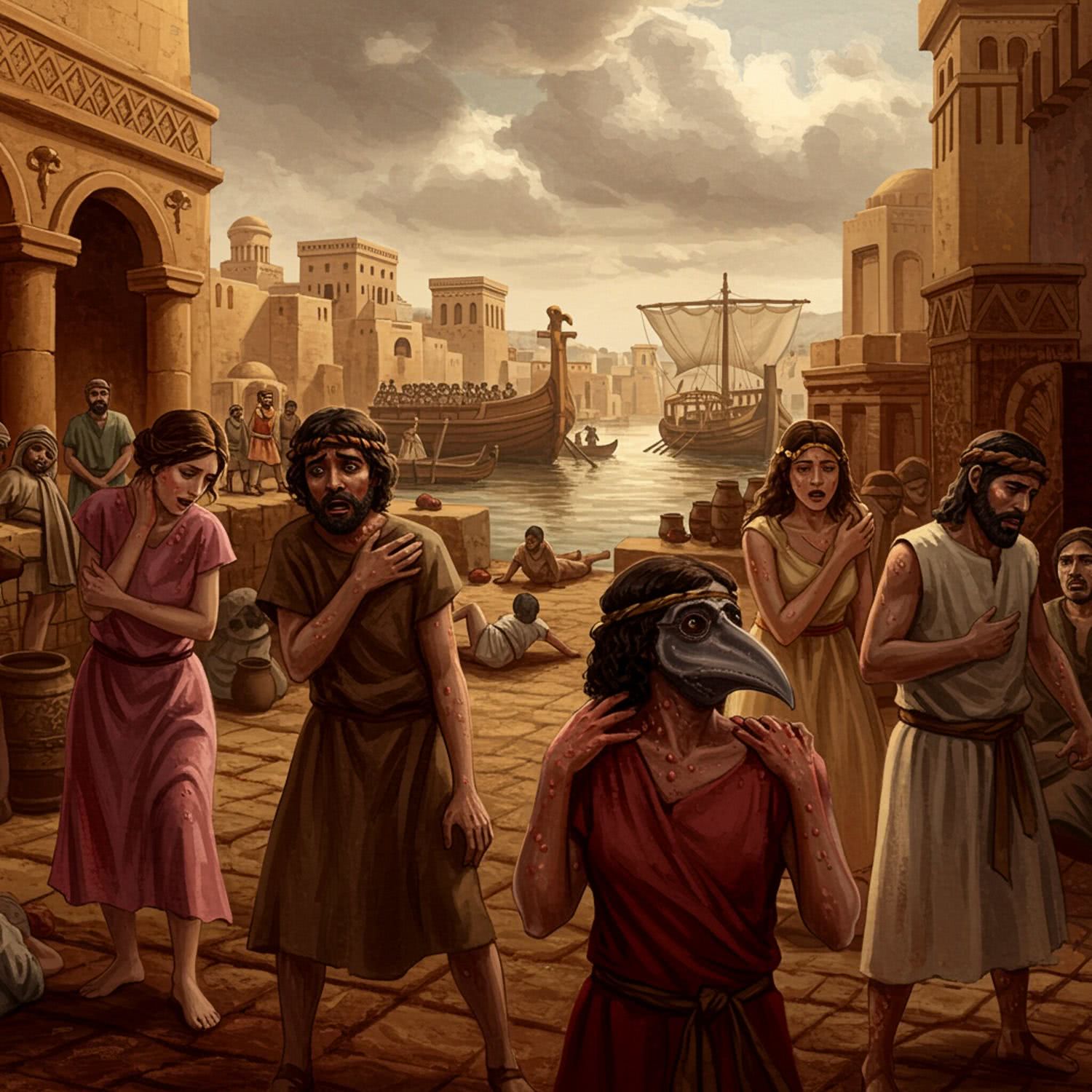 Semi-realistic illustration: of a bustling ancient Egyptian port during the Justinian Plague, set in a scene of chaos and fear. The focus is on several people with visible signs of the plague, such as swollen lymph nodes and blisters, their expressions conveying distress. The background shows the port of Pelusium with docked trading ships and Byzantine architecture, under a cloudy sky. The atmosphere is tense and somber, enhanced by the sepia tones. The scene avoids overly complex foreground elements to maintain focus on the main subjects, ensuring a realistic and dramatic portrayal of the historical setting. IMAGE STYLE: Use a vivid color palette of deep red, orange, deep brown, gray and a touch of purple and bright red to give the impression of the threat of diseases and the epidemics they cause.
