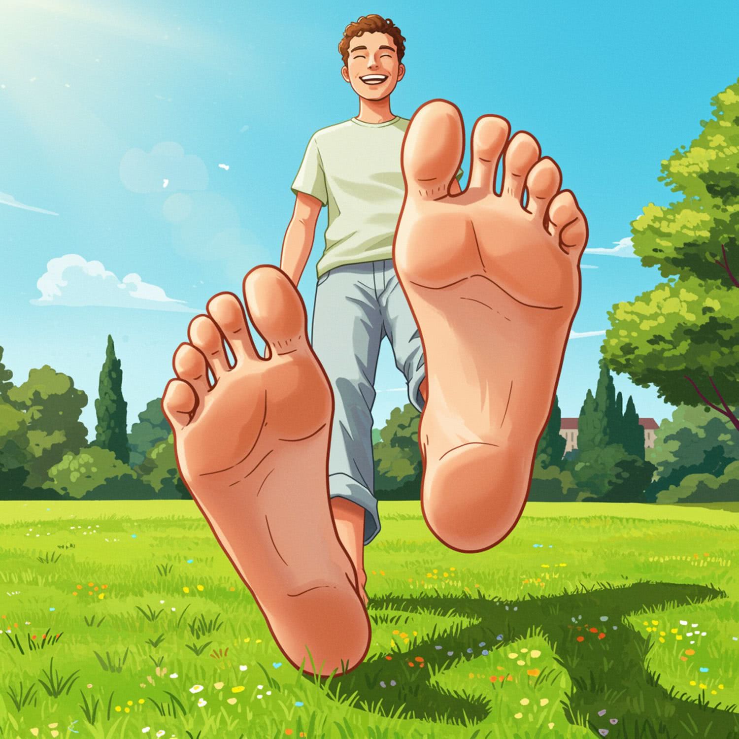 Semi-realistic illustration: of a smiling person with healthy feet, walking barefoot on lush green grass in a sunny park. The person has a relaxed expression, wearing casual, light-colored clothing. The background features a clear blue sky and distant trees, with no distracting elements. The focus is primarily on the person’s face and feet, showcasing smooth skin and natural movement. The scene uses vibrant, positive colors to emphasize vitality and well-being, symbolizing health, hygiene, and an active lifestyle post-recovery. IMAGE STYLE: Use a vibrant color palette with predominantly warm tones. The mood should be warm, joyful, the kind that accompanies a person who has been cured of an ailment.
