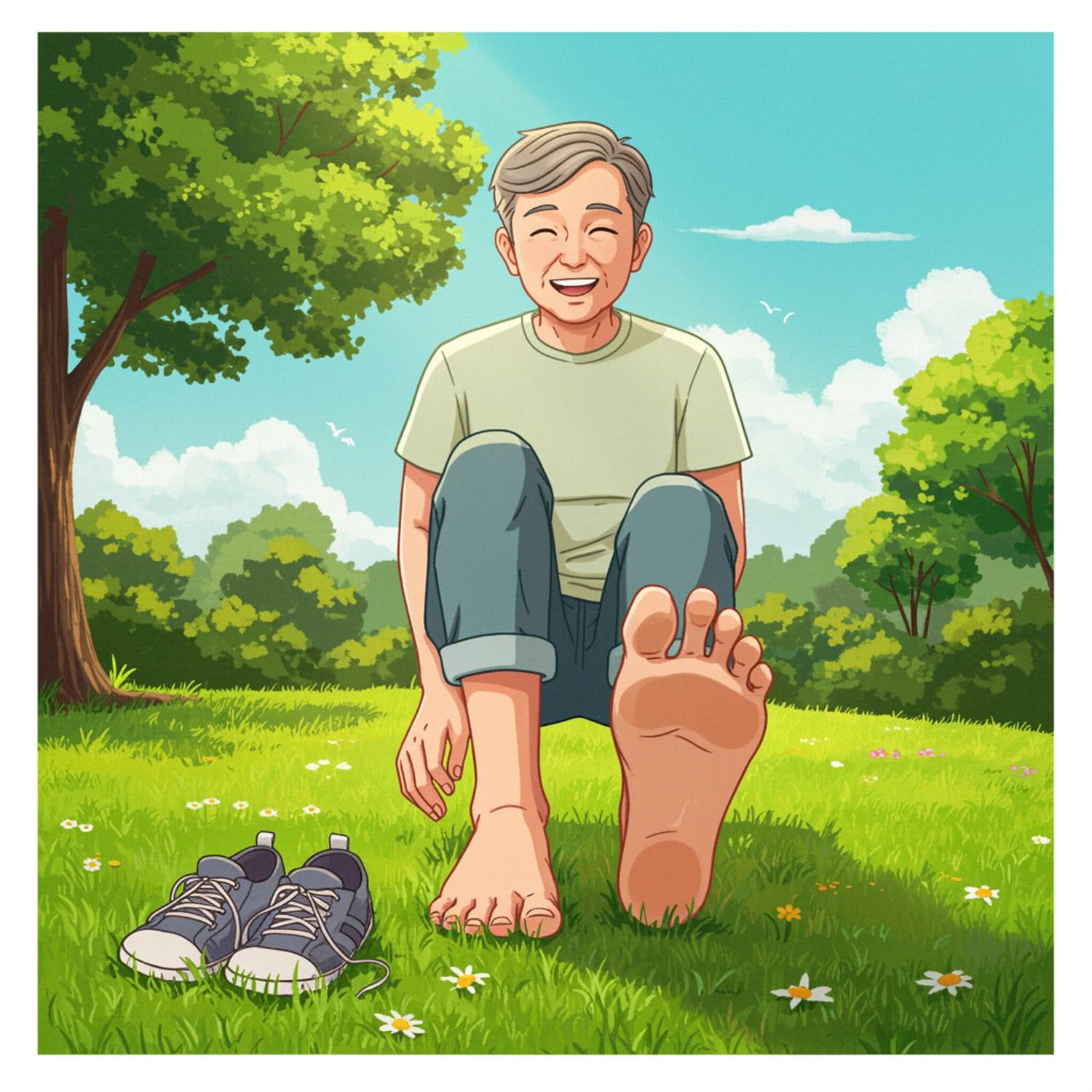 Semi-realistic illustration: of a smiling middle-aged person with short, neat hair, dressed in casual, comfortable clothing, standing on lush green grass in a sunny park. The person’s feet, with well-cared-for toenails, are visible, symbolizing daily foot care. The background features a few trees and a clear blue sky, creating a serene and positive environment. A pair of comfortable shoes is placed on the grass near the person, emphasizing a healthy, active lifestyle. The scene is lit with soft, natural sunlight, enhancing the cheerful and inviting atmosphere of the image. IMAGE STYLE: Use a vibrant color palette with predominantly warm tones. The mood should be warm, joyful, the kind that accompanies a person who has been cured of an ailment.