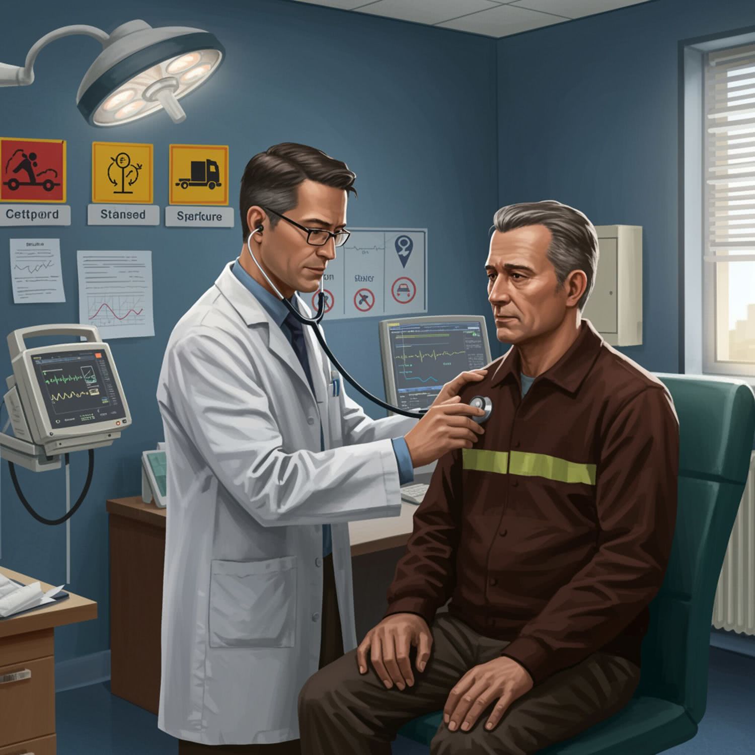 Semi-realistic illustration: of a male doctor in his 40s, wearing a white lab coat and a stethoscope around his neck, examining a middle-aged truck driver in a modern medical office. The doctor has a focused expression, while the driver appears attentive. The background features subtle medical equipment like an ECG machine and transport safety symbols on the walls, lit by natural light from a window. The room has a clean, professional atmosphere without any distracting elements, emphasizing a preventive healthcare setting for the transportation industry. IMAGE STYLE: Use a sophisticated color palette of deep brown, deep blue, gray, and a touch of purple, red and orange for a high-tech feel. The background should suggest modern medicine. The mood should be precise, educational, and cutting-edge, appealing to medical professionals and students.