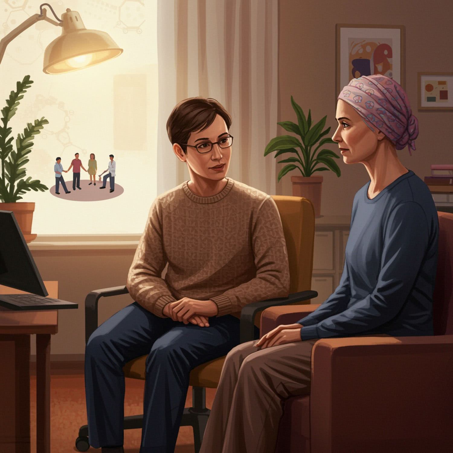 Semi-realistic illustration: of a psychooncologist in a warm, well-lit office, engaged in a conversation with a calm and supported cancer patient. The psychooncologist, dressed in a professional yet comforting sweater, is seated facing the patient, who appears relaxed and dressed casually. The background features soft, natural lighting and subtle elements of support, such as a small group of people in a circle and indoor plants, without distracting from the main subjects. The room is decorated with warm, earthy tones, enhancing the holistic and optimistic atmosphere. The focus is primarily on the faces of the psychooncologist and the patient, emphasizing their supportive interaction. IMAGE STYLE: Use a sophisticated color palette of deep brown, deep blue, gray, and a touch of purple, red and orange for a high-tech feel. The background should suggest modern medicine. The mood should be precise, educational, and cutting-edge, appealing to medical professionals and students.