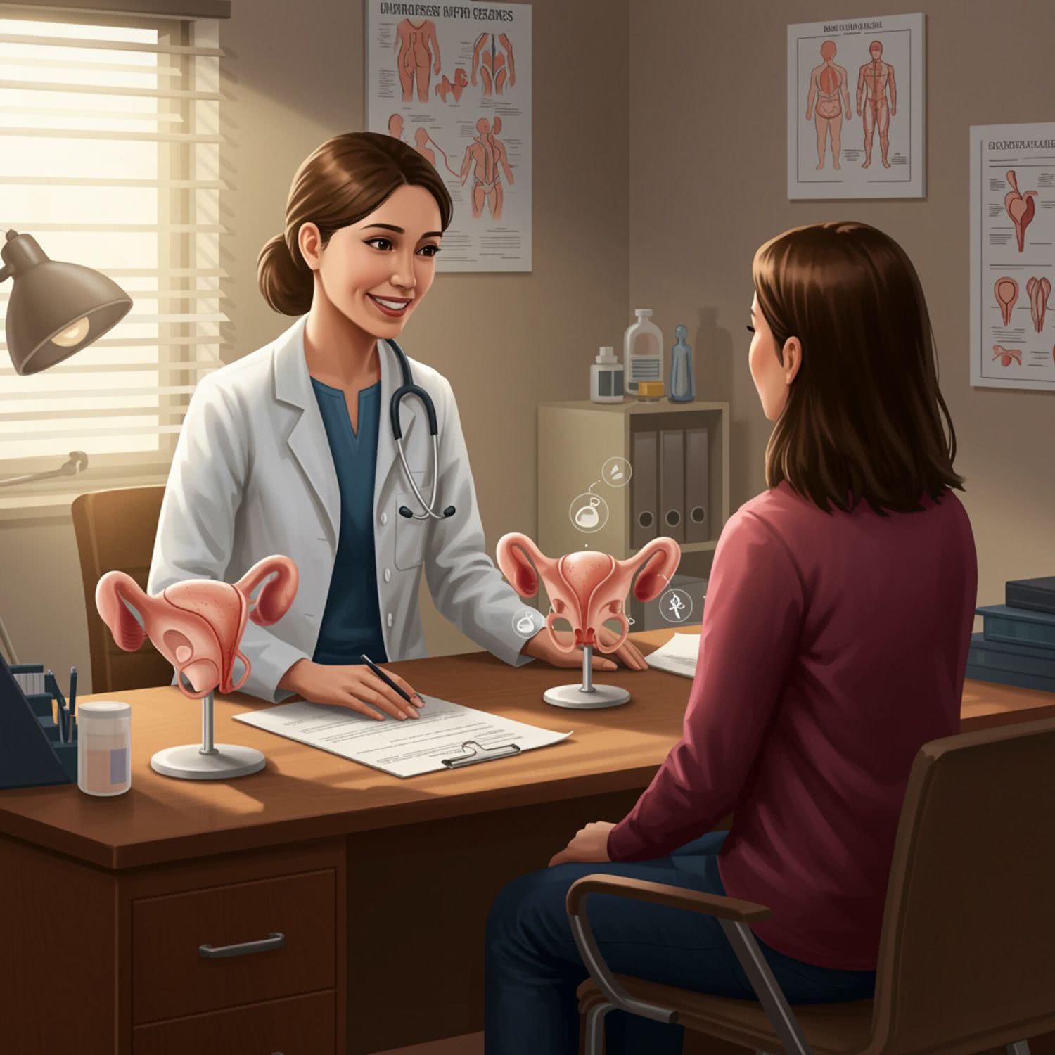 Semi-realistic illustration: of a female gynecologist in a white lab coat, smiling warmly at her seated female patient in a cozy, well-lit medical office. The room features warm, calming colors with medical posters on the walls. On the desk between them are visible models of the pelvic floor and icons symbolizing bladder control exercises. In the background, there is a stethoscope and a few medical charts, maintaining a clutter-free environment. The setting emphasizes empathy and a holistic approach to healthcare, with natural light filtering through a window, enhancing the serene atmosphere. IMAGE STYLE: Use a sophisticated color palette of deep brown, deep blue, gray, and a touch of purple, red and orange for a high-tech feel. The background should suggest modern medicine. The mood should be precise, educational, and cutting-edge, appealing to medical professionals and students.