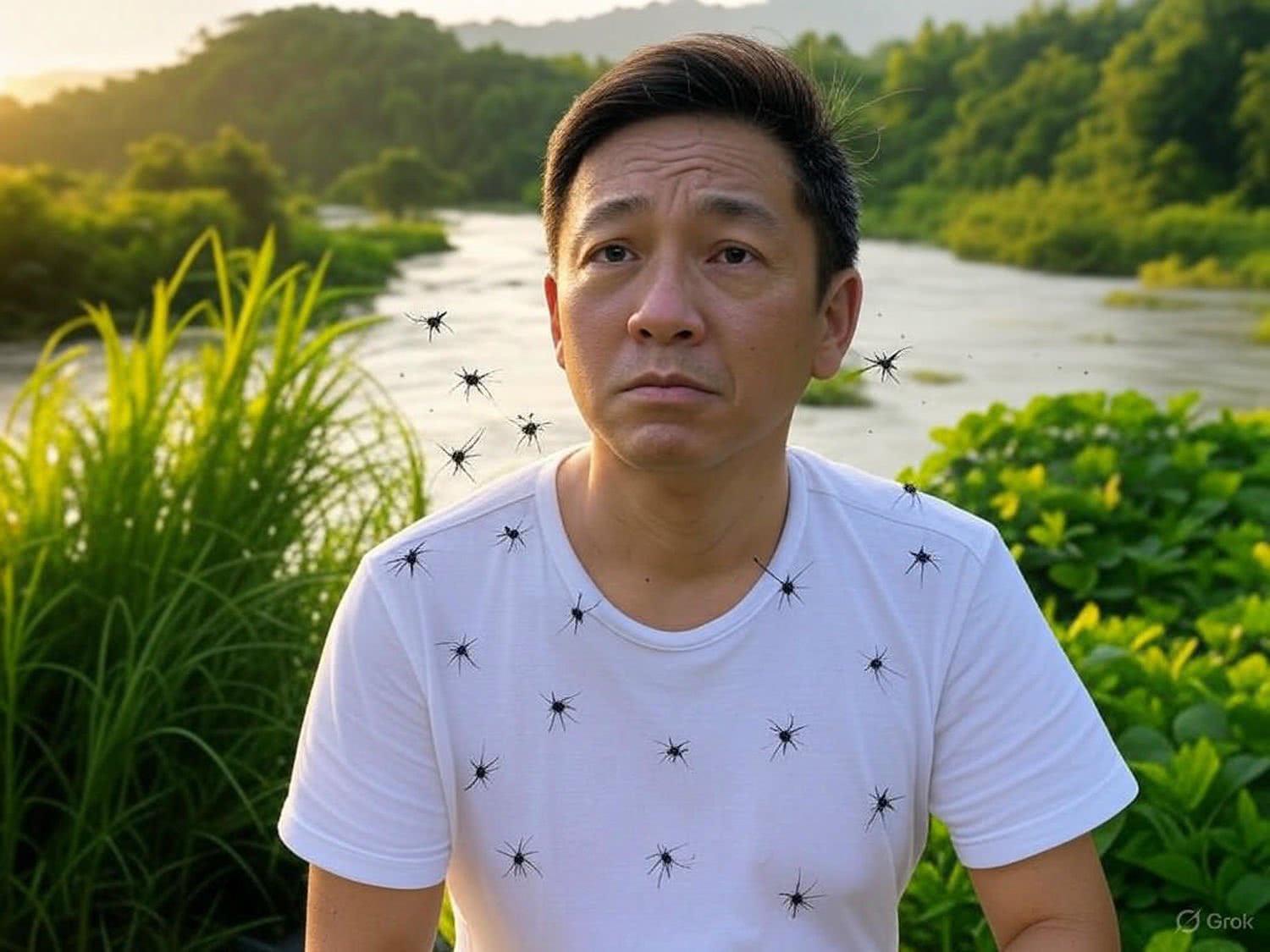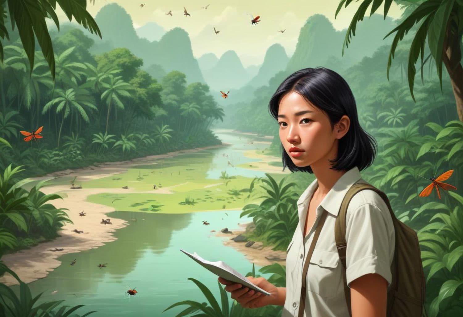 Semi-realistic illustration: of a concerned tourist in a tropical Asian landscape during the day. The tourist, dressed in light summer clothing, is surrounded by mosquitoes symbolizing disease vectors. The background features lush green foliage and a river with signs of flooding, illustrating climate change effects. The scene uses warm colors to reflect rising temperatures. In the background, a subtle map of Asia with migration lines is visible, adding context without distracting from the main subject. The overall composition focuses on the tourist’s face and the immediate environment, emphasizing the impact of climate change and disease risks in a realistic setting. IMAGE STYLE: Use a sophisticated color palette of deep brown, deep blue, gray, and a touch of purple, red and orange for a high-tech feel. The background should suggest modern medicine. The mood should be precise, educational, and cutting-edge, appealing to medical professionals and students.
