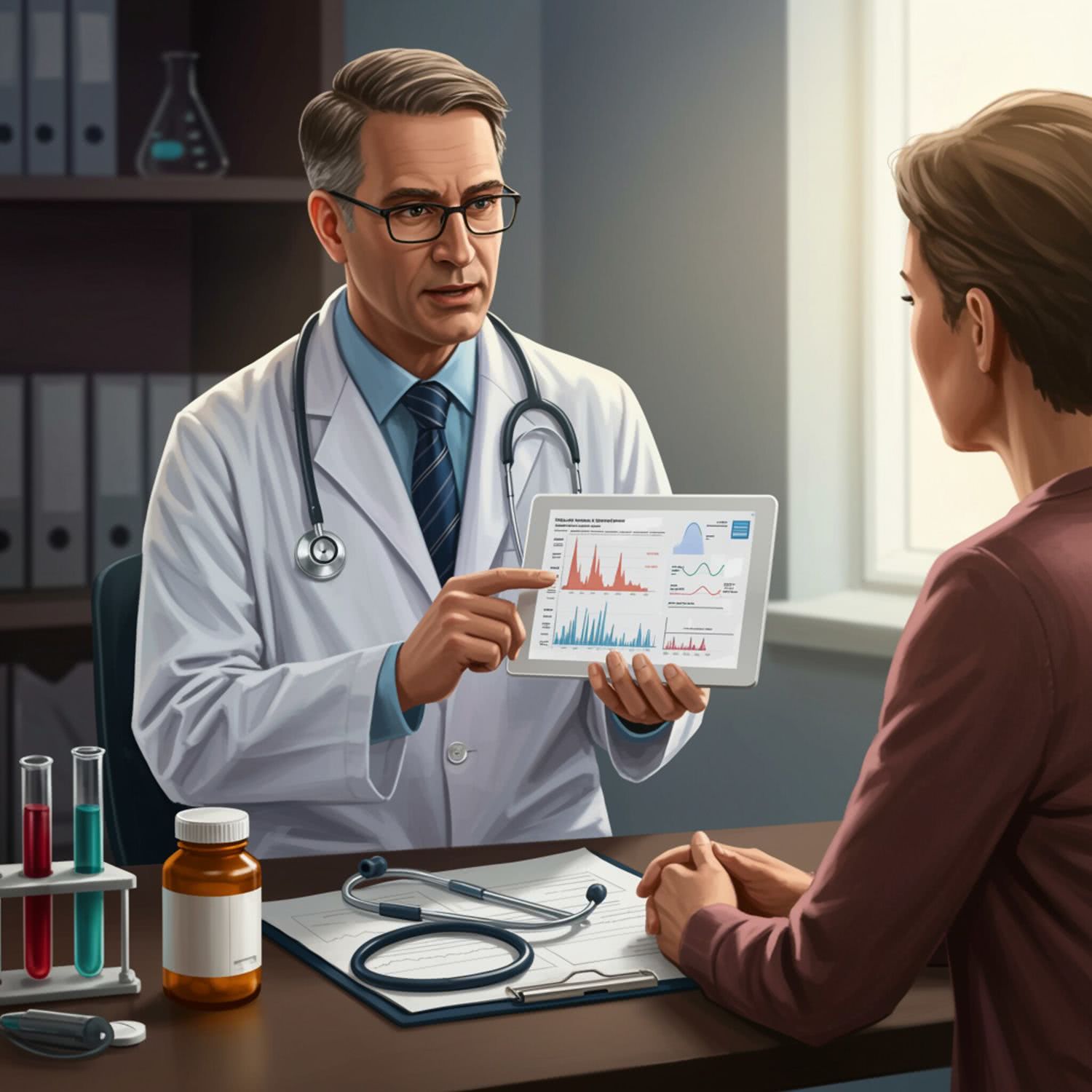 Semi-realistic illustration: of a middle-aged male clinical pharmacology specialist in a well-lit, modern medical office, discussing medication adjustments with a patient. The doctor, wearing a white lab coat, holds a tablet with medication graphs and a bottle of pills in one hand, pointing at the graphs with the other. The patient, dressed in casual attire, listens attentively, seated across from the doctor. The background features a stethoscope and test tubes on a shelf, with soft natural light entering through a window. The office has a professional yet welcoming atmosphere, with muted, professional colors and minimalistic decor, focusing primarily on the interaction between the doctor and patient. IMAGE STYLE: Use a sophisticated color palette of deep brown, deep blue, gray, and a touch of purple, red and orange for a high-tech feel. The background should suggest modern medicine. The mood should be precise, educational, and cutting-edge, appealing to medical professionals and students.