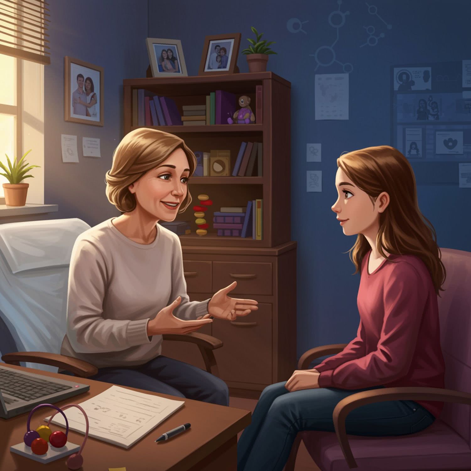 Semi-realistic illustration: of a child psychiatrist, a middle-aged woman with a gentle smile, dressed in a soft-colored sweater, speaking empathetically to a young teenage girl in a cozy, well-lit office. The office features warm, pastel wall colors and a bookshelf filled with children’s books and therapeutic toys. A window with natural light and a small indoor plant add to the welcoming atmosphere. The background subtly includes a framed family photo, suggesting collaboration with parents, without distracting from the main subjects. The composition focuses primarily on the psychiatrist and the teenager, creating a balanced and supportive scene that highlights positive emotions and personal growth. IMAGE STYLE: Use a sophisticated color palette of deep brown, deep blue, gray, and a touch of purple, red and orange for a high-tech feel. The background should suggest modern medicine. The mood should be precise, educational, and cutting-edge, appealing to medical professionals and students.