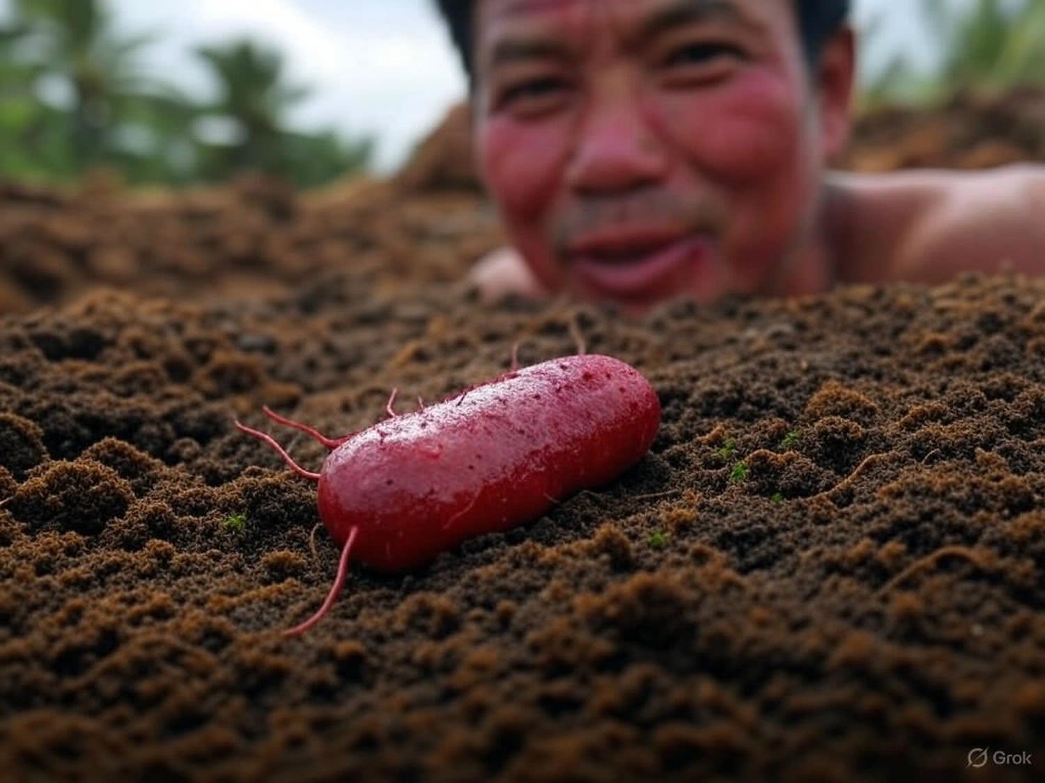 Semi-realistic illustration: of a close-up of the bacterium Burkholderia pseudomallei in a tropical soil and water setting in southern Asia, with a farmer in the background showing signs of fever and a skin wound. The scene is set during the day with natural lighting, highlighting the bacterium and the farmer’s face. The background subtly includes elements of a tropical environment and hints of a map of Hainan. The color palette consists of greens and browns for the environment, with red accents on the farmer’s flushed skin to emphasize the danger and prevention aspects. The composition focuses on the bacterium and the farmer, ensuring they are the main subjects without distracting foreground or background elements. IMAGE STYLE: Use a sophisticated color palette of deep brown, deep blue, gray, and a touch of purple, red and orange for a high-tech feel. The background should suggest modern medicine. The mood should be precise, educational, and cutting-edge, appealing to medical professionals and students.