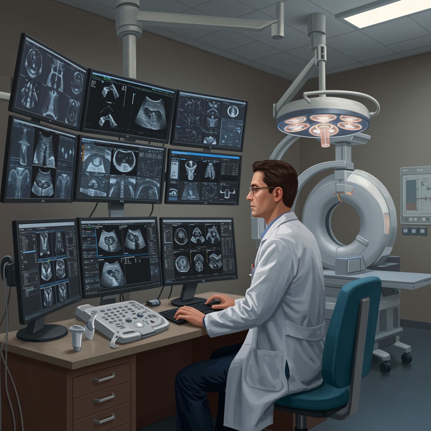 Semi-realistic illustration: of a radiologist in a modern, sterile hospital diagnostic room, wearing a white lab coat and focused on multiple computer monitors displaying various medical images such as X-rays, ultrasound scans, CT, MRI, and PET. The room features minimalistic decor with neutral colors, and essential medical equipment like an ultrasound probe and an X-ray machine are visible in the background. The lighting is soft and natural, enhancing the professional atmosphere without distractions. The radiologist’s face is clearly visible, emphasizing concentration and professionalism, with the background slightly blurred to maintain focus on the main subject. IMAGE STYLE: Use a sophisticated color palette of deep brown, deep blue, gray, and a touch of purple, red and orange for a high-tech feel. The background should suggest modern medicine. The mood should be precise, educational, and cutting-edge, appealing to medical professionals and students.