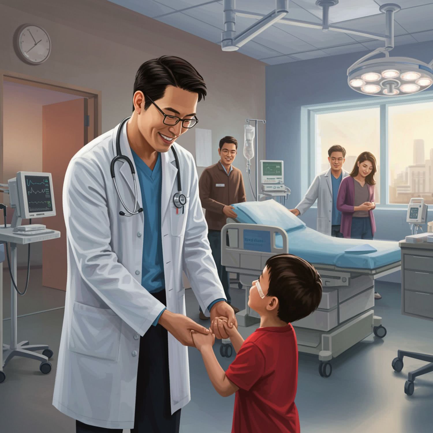 Semi-realistic illustration: of a pediatric oncology and hematology specialist in a white coat smiling empathetically at a young child in a modern, well-lit hospital room. The doctor is gently holding the child’s hand, conveying warmth and support. The child, dressed in casual clothes, looks up at the doctor with a slight smile. In the background, the child’s parents are visible, watching the interaction with hopeful expressions. The room features soft, pastel wall colors and natural light from a window, with subtle medical equipment like a stethoscope and monitors in the background. The overall composition focuses on the doctor and child, creating an atmosphere of hope and care, without any overly clinical or distracting elements. IMAGE STYLE: Use a sophisticated color palette of deep brown, deep blue, gray, and a touch of purple, red and orange for a high-tech feel. The background should suggest modern medicine. The mood should be precise, educational, and cutting-edge, appealing to medical professionals and students.