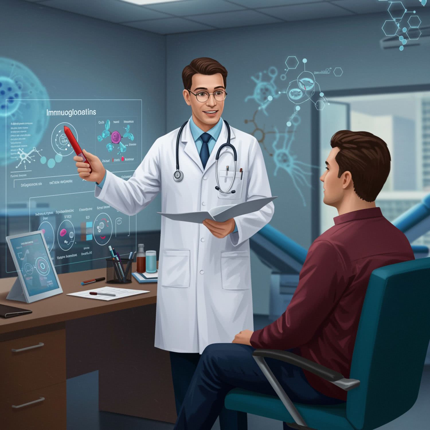 Semi-realistic illustration: of a male doctor in a white lab coat, with a stethoscope around his neck, in a modern medical office. He is pointing at a screen displaying blood test results, including levels of immunoglobulins and types of immune cells like lymphocytes and neutrophils. The doctor has a friendly and professional expression as he discusses the results with a seated patient. The background features subtle, educational symbols of the immune system, with a dominant use of blue and green colors to emphasize health and science. The office is well-lit with natural light, and there are no distracting elements or text, maintaining a focused and engaging composition. IMAGE STYLE: Use a sophisticated color palette of deep brown, deep blue, gray, and a touch of purple, red and orange for a high-tech feel. The background should suggest modern medicine. The mood should be precise, educational, and cutting-edge, appealing to medical professionals and students.