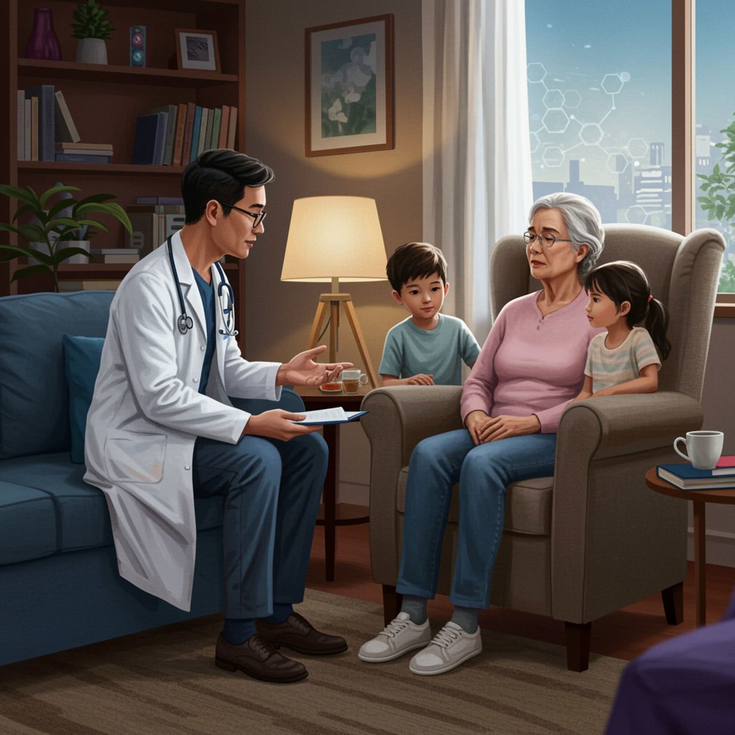Semi-realistic illustration: of a compassionate doctor in a white lab coat having an empathetic conversation with a calm and supported patient in a cozy, well-lit living room. The patient, appearing peaceful and surrounded by family, is seated comfortably in an armchair. The room features soft, warm lighting, possibly from a nearby window, and is decorated with indoor plants and subtle, comforting decor. The background includes a bookshelf and a window, maintaining a focus on the main subjects without distractions. The overall composition emphasizes the emotional connection and holistic care in a palliative care setting, using muted, soothing colors to convey a sense of relief and comfort. IMAGE STYLE: Use a sophisticated color palette of deep brown, deep blue, gray, and a touch of purple, red and orange for a high-tech feel. The background should suggest modern medicine. The mood should be precise, educational, and cutting-edge, appealing to medical professionals and students.