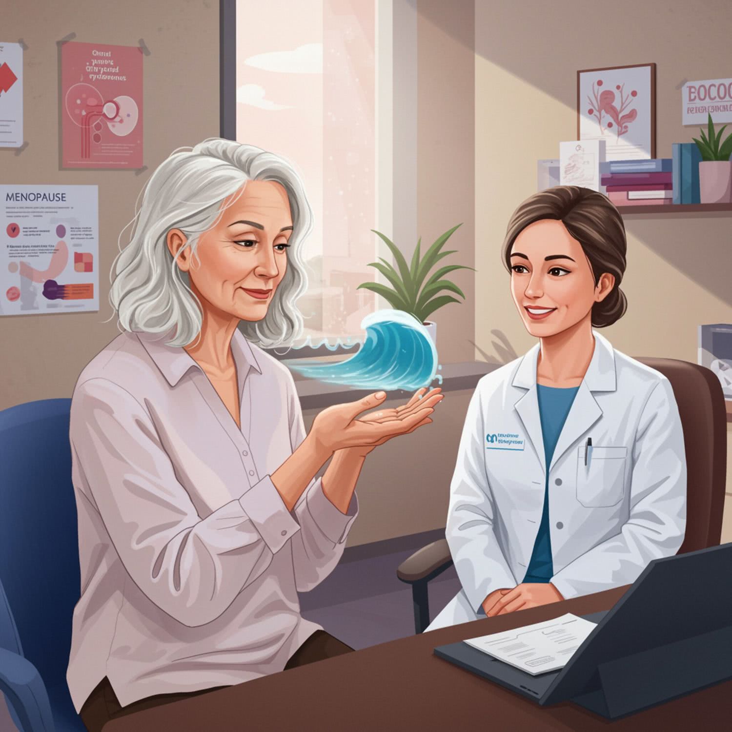 Semi-realistic illustration: of an older woman in her 50s with graying hair, dressed in a soft pastel blouse, sitting in a well-lit medical office. She appears calm and confident, holding a delicate wave symbolizing menopause. Next to her, a smiling geriatric gynecologist in a white lab coat is seated, creating a supportive and caring atmosphere. The background features pastel-colored walls, a large window with natural light, and subtle elements like potted plants and health-related books on shelves. The office decor includes motivational posters and a few pieces of artwork, maintaining a cozy and inviting environment without unnecessary distractions. The overall composition focuses on the woman and the doctor, highlighting their interaction in a warm, pastel-toned setting. IMAGE STYLE: Use a sophisticated color palette of deep brown, deep blue, gray, and a touch of purple, red and orange for a high-tech feel. The background should suggest modern medicine. The mood should be precise, educational, and cutting-edge, appealing to medical professionals and students.