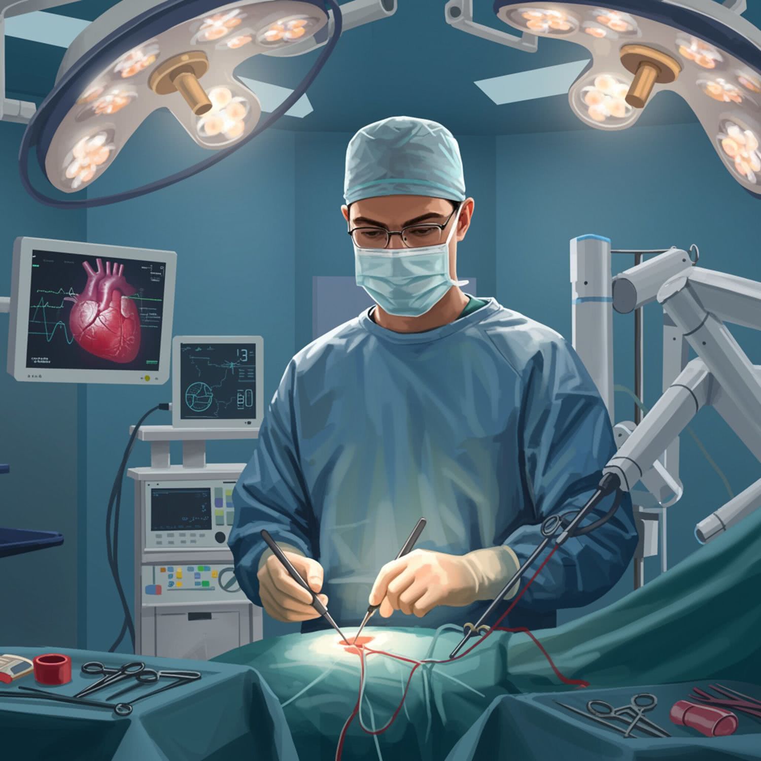 Semi-realistic illustration: of a male cardiac surgeon in a modern operating room, focused on performing heart surgery with minimally invasive tools. The surgeon, wearing surgical scrubs and a mask, is centrally positioned with his face clearly visible, showing concentration. The background features essential medical equipment in muted blue and white tones, enhancing the professional and clinical atmosphere. The heart of the patient is visible on a monitor, and subtle robotic surgical arms are assisting the procedure. The room is brightly lit with surgical lights, and the overall scene is devoid of unnecessary clutter, emphasizing the surgeon’s expertise and the advanced technology used. IMAGE STYLE: Use a sophisticated color palette of deep brown, deep blue, gray, and a touch of purple, red and orange for a high-tech feel. The background should suggest modern medicine. The mood should be precise, educational, and cutting-edge, appealing to medical professionals and students.
