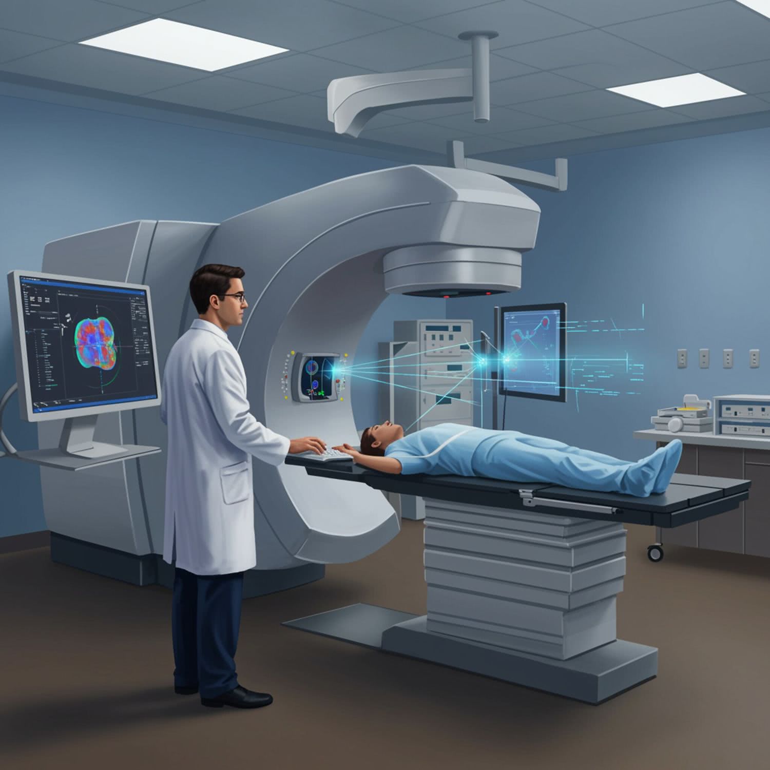 Semi-realistic illustration: of a male oncological radiotherapist in a modern treatment room, wearing a white lab coat and standing beside an advanced linear accelerator. He is focused on a computer screen displaying a 3D model of a tumor, with beams of radiation precisely directed towards the tumor. In the background, a patient lies on a treatment table, slightly out of focus to maintain emphasis on the doctor and the technology. The room features a professional and educational atmosphere with subdued blue and white colors, typical of a hospital setting. The composition is balanced, with no distracting foreground elements, ensuring all focus remains on the precision of the treatment and the doctor’s concentration. IMAGE STYLE: Use a sophisticated color palette of deep brown, deep blue, gray, and a touch of purple, red and orange for a high-tech feel. The background should suggest modern medicine. The mood should be precise, educational, and cutting-edge, appealing to medical professionals and students.