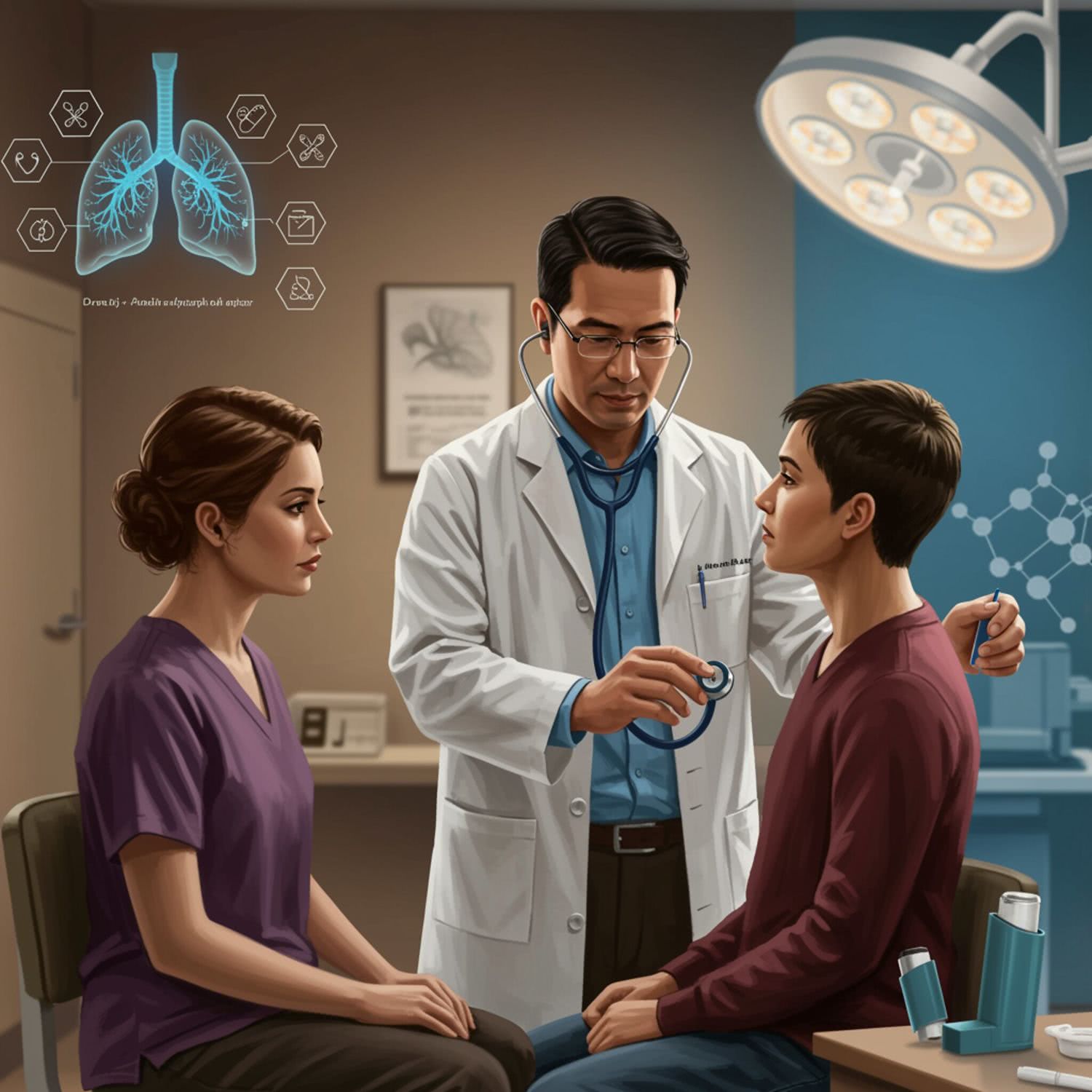 Semi-realistic illustration: of a pulmonologist in a white lab coat using a stethoscope to examine a patient in a modern, well-lit medical office. The pulmonologist, with a focused expression, is the central figure in the foreground, with the patient seated and slightly to the side. The background subtly features symbols of the respiratory system, such as simplified lung diagrams and an inhaler on a nearby table, without distracting from the main interaction. The room has warm, soft lighting and neutral wall colors, creating a professional yet comforting atmosphere. The overall composition emphasizes the care and attention provided in a medical setting, with no unnecessary foreground elements or text. IMAGE STYLE: Use a sophisticated color palette of deep brown, deep blue, gray, and a touch of purple, red and orange for a high-tech feel. The background should suggest modern medicine. The mood should be precise, educational, and cutting-edge, appealing to medical professionals and students.