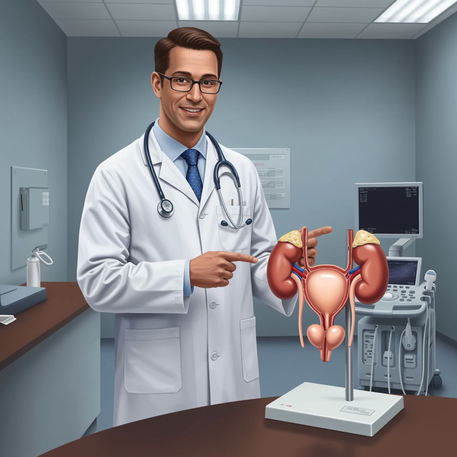 Semi-realistic illustration: of a male urologist in a modern, well-lit medical office, wearing a white lab coat and a stethoscope around his neck. He is standing beside a detailed anatomical model of the urinary system, including kidneys, bladder, and prostate, and is pointing at the model with a friendly and informative expression. The background features neutral-colored walls and subtle medical equipment, such as an ultrasound machine, without any distracting elements. The overall composition emphasizes the doctor and the anatomical model, creating a professional yet approachable atmosphere focused on health education. IMAGE STYLE: Use a sophisticated color palette of deep brown, deep blue, gray, and a touch of purple, red and orange for a high-tech feel. The background should suggest modern medicine. The mood should be precise, educational, and cutting-edge, appealing to medical professionals and students.